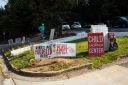 A protester stands at the exit of the Feminist Women’s Health Center amongst signs they brought in Atlanta, Georgia July 8, 2022. At the entrance another man records everyone who enters on his cellphone. Another man chants into a megaphone, “You’re walking up the steps to the gates of hell to kill a baby for the crime of being inconvenient. How do you justify child sacrifice? This is the American holocaust. You’ve come to Satan’s house to pay someone to kill your own child,” and on and on to each person who entered the parking lot. You can hear him at the Atlanta clinic entrance July 8, 2022. -