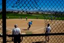 Sun City Palm Desert (red) plays Sun City Shadow Hills (blue) in a softball game in Indio, California. Both teams are made up of retirees 55 and older. “People ask me what do you do? I say, well, I play,” player Phil Wolff, seen at first, said of retirement.