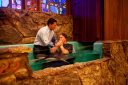 Associate Pastor Nathan Winters baptizes Casey Robbins who departs for the Air Force the following day during the service at First Baptist Church in Thermopolis, Wyoming.
