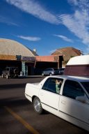 A dog awaits its owner who is inside of the TePee Spa at Hot Springs State Park in Thermopolis, Wyoming.